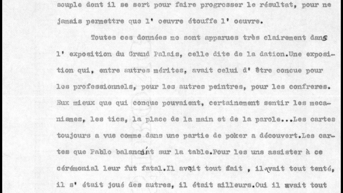 The artist Eduardo Arroyo sends Javier Tusell, director-general of Fine Arts, a text on Picasso which will appear in the magazine L'Arc.
