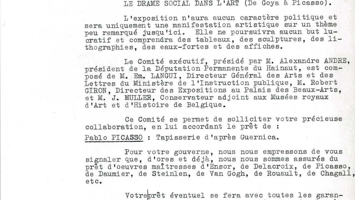 Émile Langui, director-general of Fine Arts and Letters at the Belgian Ministry of Education, informs Nelson Rockefeller of issues regarding the exhibition Le drame social dans l'art at the Palais des Beaux-Arts, Brussels, and its Organising Committee, and asks for the loan of the replica Guernica tapestry.
