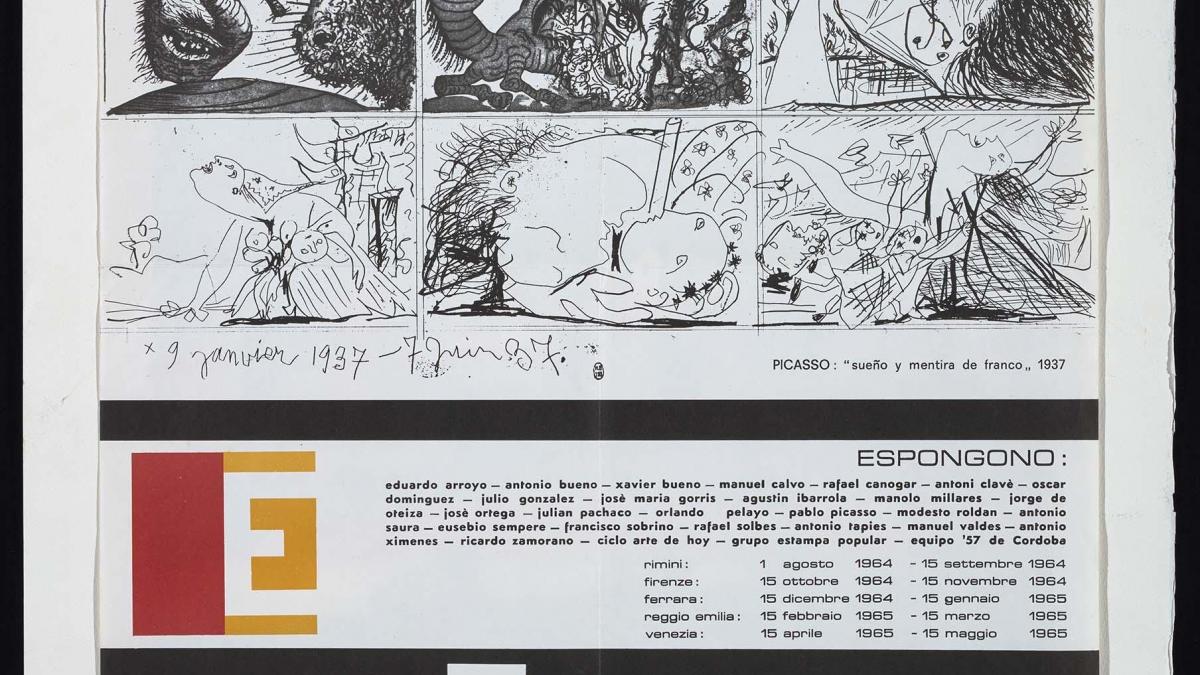 A poster with a reproduction of one of the Dream and Lie of Franco prints for the touring exhibition España Libre.