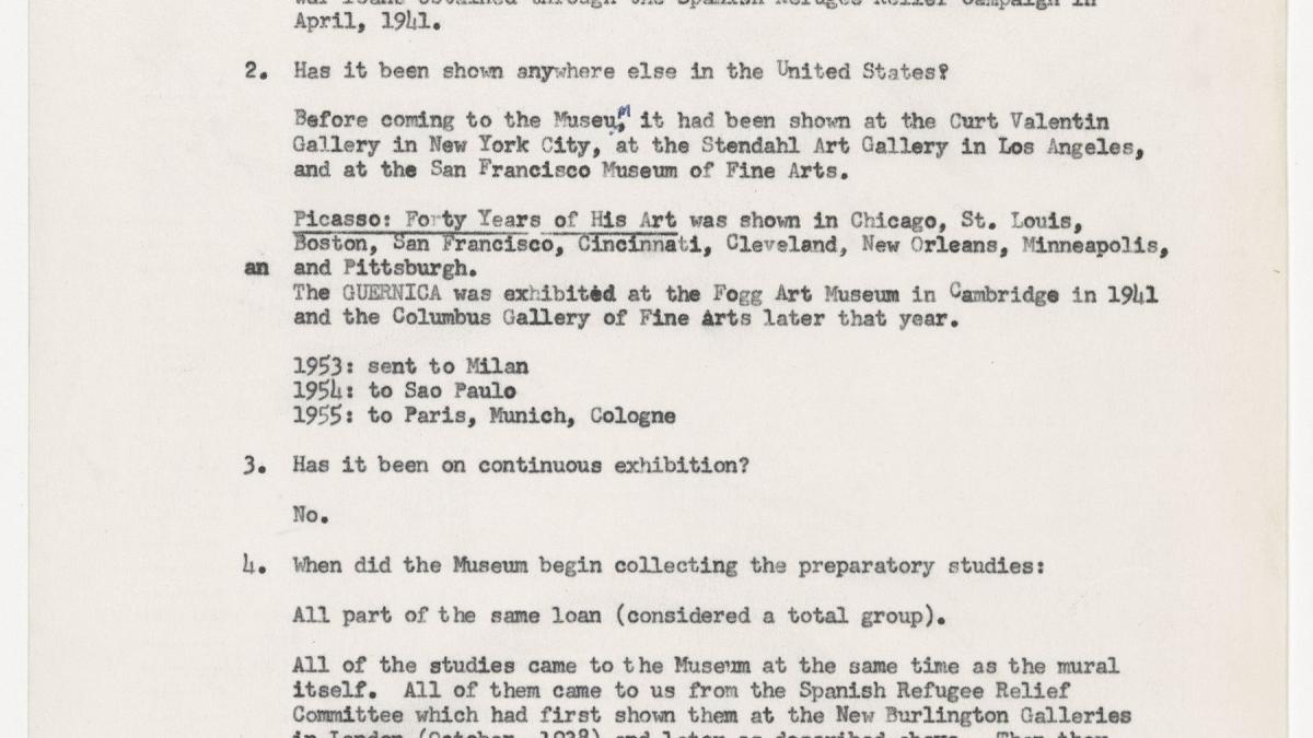 An internal document from the Museum of Modern Art, New York, with questions and answers on the history of Guernica and studies.