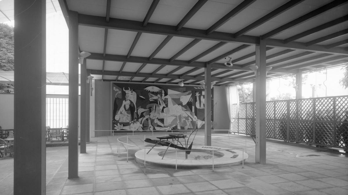 Inside the Spanish Pavilion at the Paris International Exhibition of Art and Technology in Modern Life. Pablo Picasso's Guernica and the Mercury Fountain, by Alexander Calder