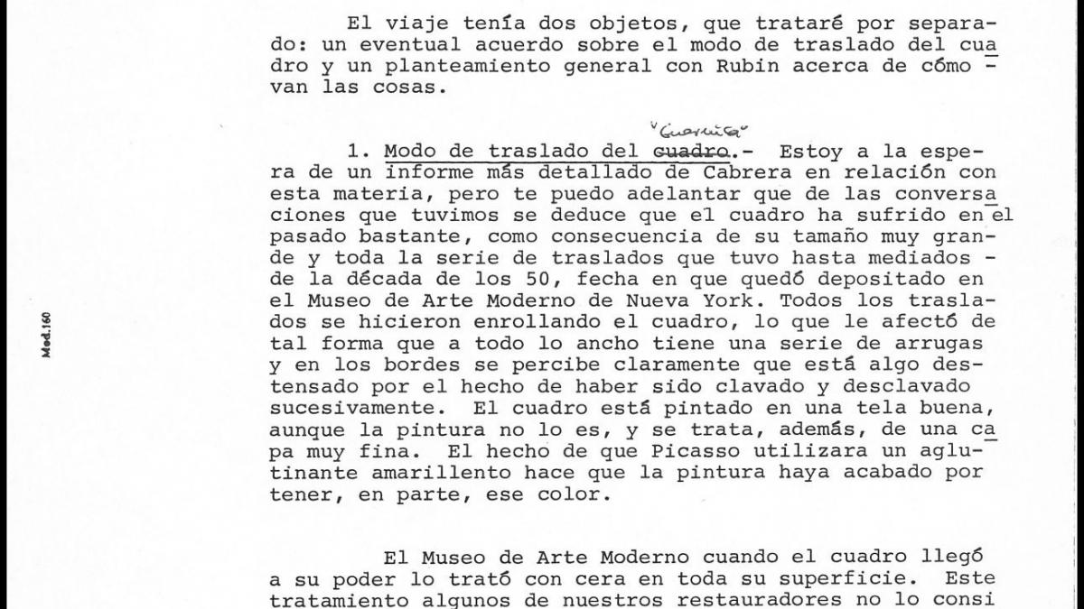 Report written to Íñigo Cavero, minister of Culture, on the meeting between Javier Tusell, director-general of Fine Arts and William Rubin, director of the Department of Painting and Sculpture at the Museum of Modern Art, New York, regarding the transfer of Guernica and negotiations with Picasso's heirs.