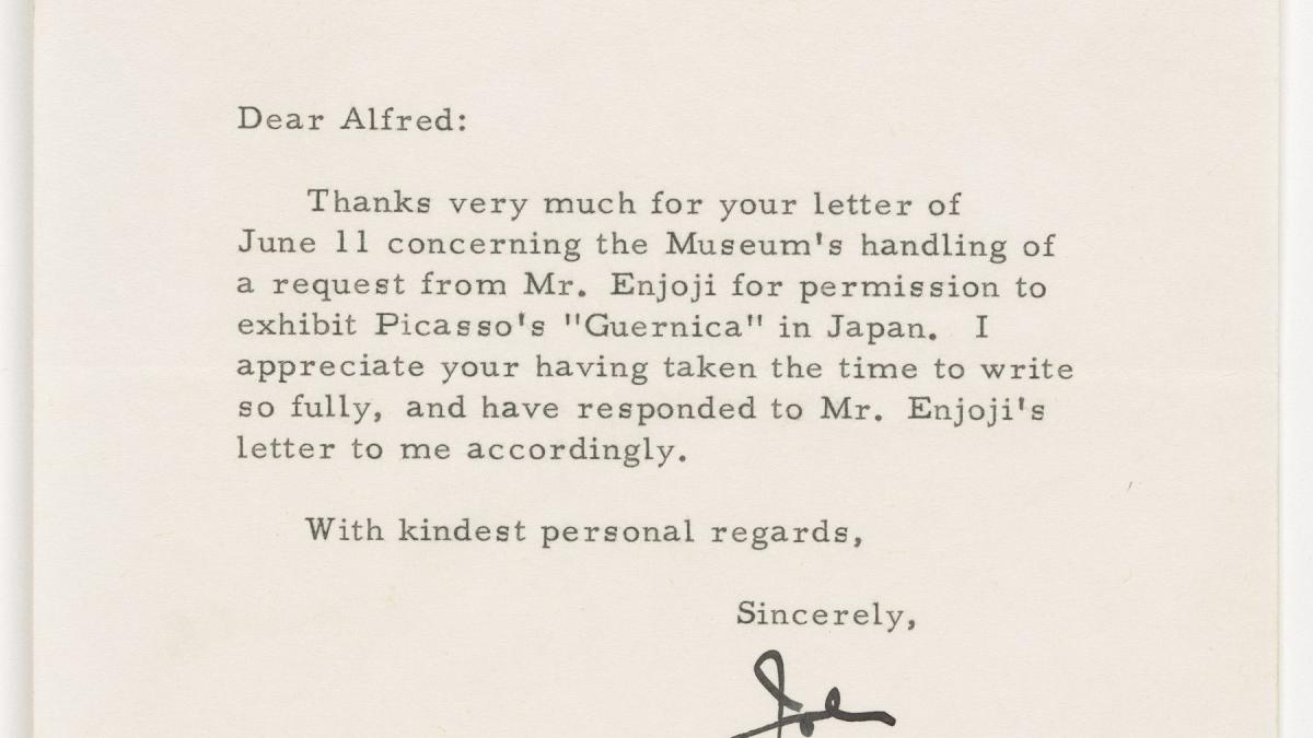 John Rockefeller thanks Alfred H. Barr Jr., director of the Collections Department at the Museum of Modern Art, New York, for dealing with the letter from Jiro Enjoji, director-general and executive editor of the financial paper Nihon Keizai Shimbun, regarding the loan of Guernica in order to exhibit it Japan.