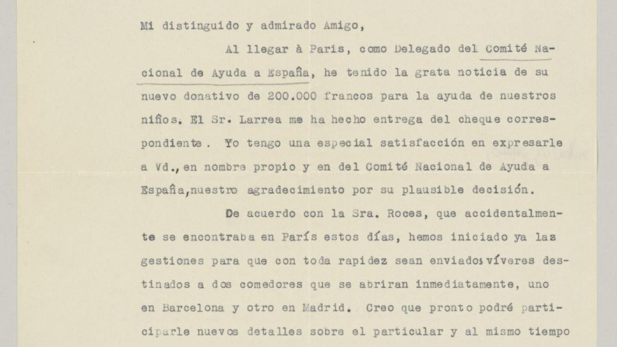 José Lino Vaamonde thanks Pablo Picasso for the cheque delivered by Juan Larrea and informs him of the destination of the funds.