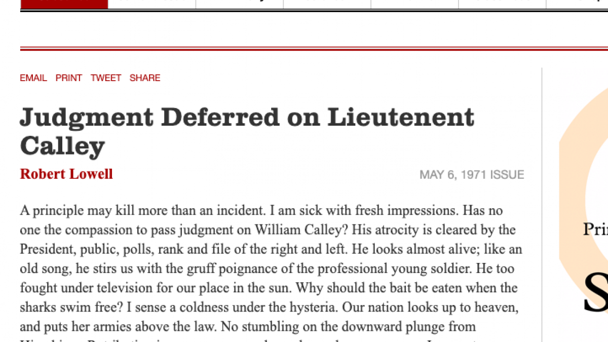 Although Lieutenant Calley was tried and found guilty of his role in the My Lai Massacre during the Vietnam War, President Nixon effectively pardoned him in April 1971 by placing him under house arrest. The anti-war poet Robert Lowell highlighted the media’s fascination with Calley as a commodity of national spectacle: “He too fought under television for our place in the sun”. The activist artists’ group Retort opened with this quote in written versions of Afflicted Powers (2004 and 2005) to draw parallels between military power and media representations of the US war in Vietnam and the US-led war in Iraq in 2003. Lowell continued: “Our nation looks up to heaven, and puts her armies above the law. No stumbling on the downward plunge from Hiroshima. Retribution is someone somewhere else and we are young. In a century perhaps no one will widen an eye at massacre, and only scattered corpses express a last histrionic concern for death”.