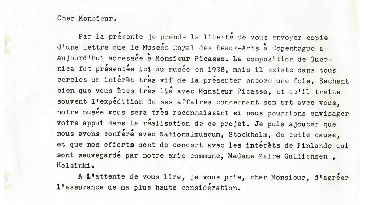 Lars Rostrup Boyesen, director of the Statens Museum for Kunst, Copenhagen, informs Daniel-Henry Kahnweiler of the letter sent to Pablo Picasso requesting permission to display Guernica . He encloses a copy of the said letter.