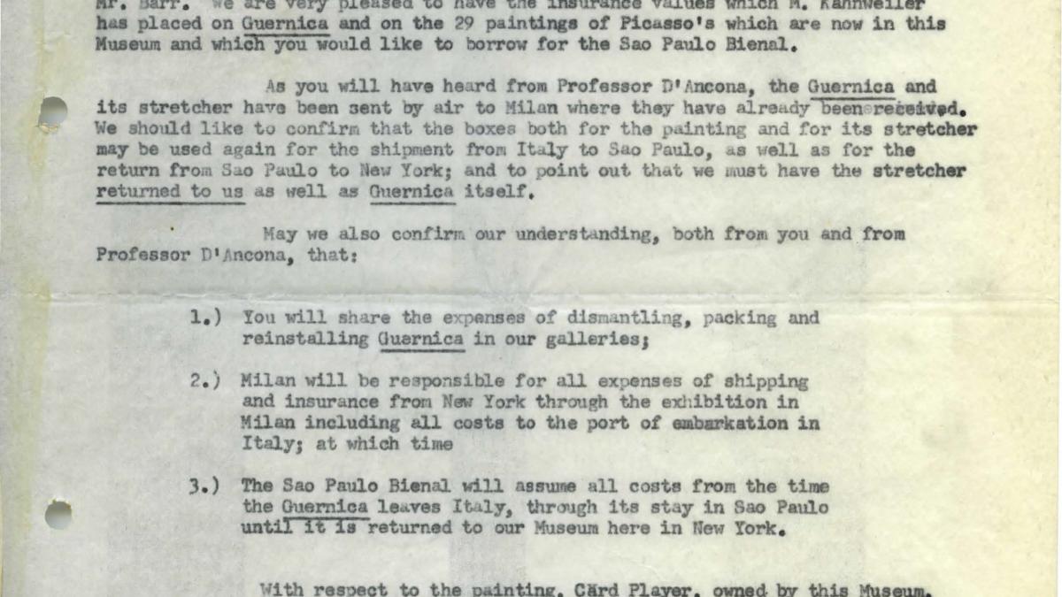 Letitia T. Howe, secretary of the Collections Department at the Museum of Modern Art, New York, and Maurice Jardot deal with matters related to the insurance and transport of Guernica and the 29 works requested on loan for the Pablo Picasso exhibition at the Second São Paulo Biennial.