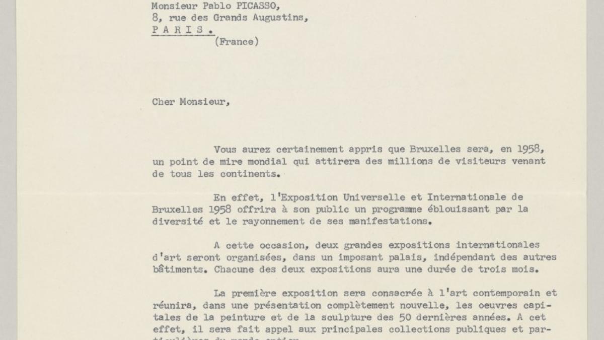 Émile Langui, director-general of Fine Arts and Letters at the Belgian Ministry of Education, sends Pablo Picasso an official request for the works they would like to display at the Brussels World's Fair in 1958, among them Guernica.