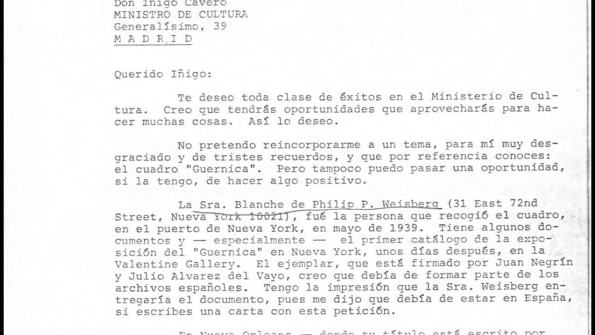 The lawyer José Mario Armero congratulates Íñigo Cavero on his appointment as Culture minister and informs him that Blanche Mahler has a catalogue from the exhibition Picasso: Forty Years of His Art, signed by Juan Negrín and Julio Álvarez del Vayo.