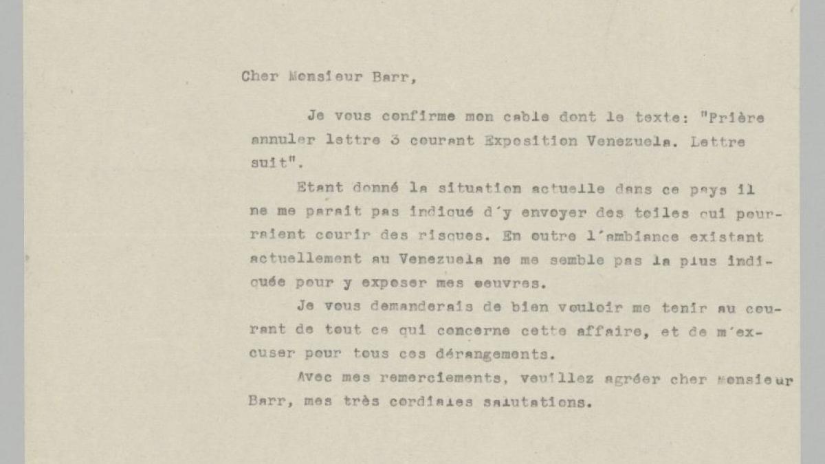 Pablo Picasso asks Alfred H. Barr Jr., director of the Collections Department at the Museum of Modern Art, New York, to cancel the loan of his paintings to Venezuela due to the political situation in the country.