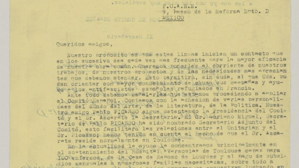 Mariano Miguel, member of an organisation to help Spanish refugees, asks for aid for Spanish refugees in France in the capacity of secretary to Pablo Picasso, the committee president.