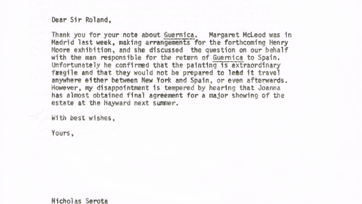 Nicholas Serota, director of the Whitechapel Gallery, writes to Roland Penrose, organiser of the English tour of Guernica during the Spanish Civil War, to inform him that Spain has confirmed that the painting is too fragile to travel.