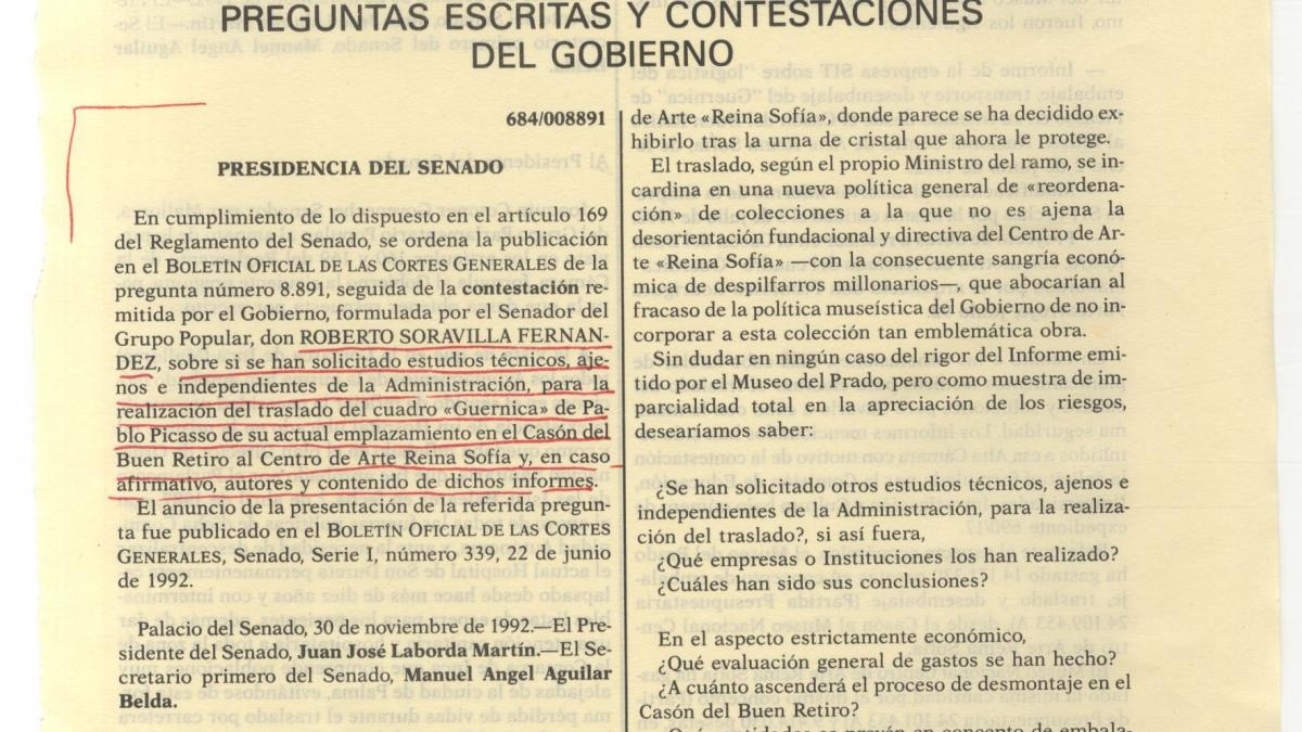 Roberto Soravilla Fernández's question from 20 November 1992 on whether the technical studies have been requested for the transfer of Guernica to the Museo Reina Sofía in Madrid.