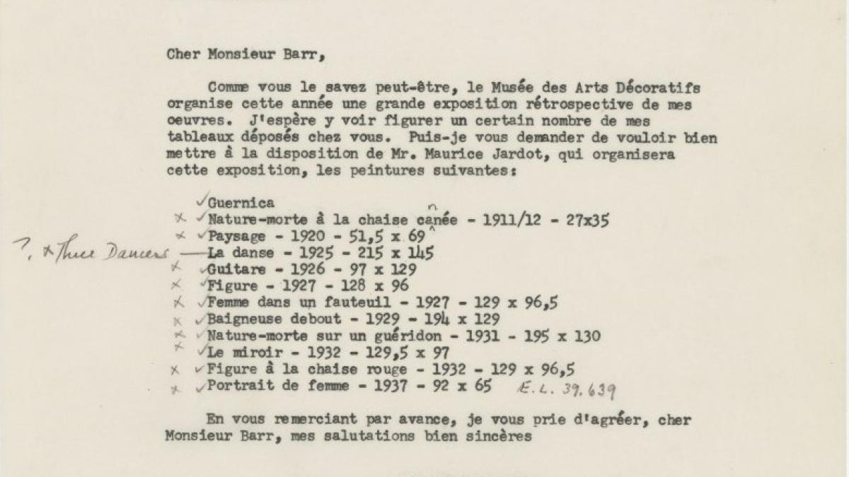 Pablo Picasso's letter to Alfred H. Barr Jr., dated 9 February 1955