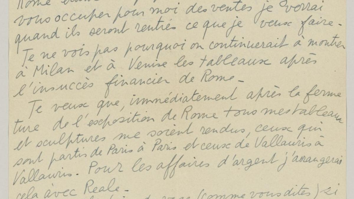Pablo Picasso tells Daniel-Henry Kahnweiler he does not see any reason to take the exhibition to Milan and Venice after the financial failure of Rome and tells him that he would like his paintings to be returned to him at the earliest possible date.