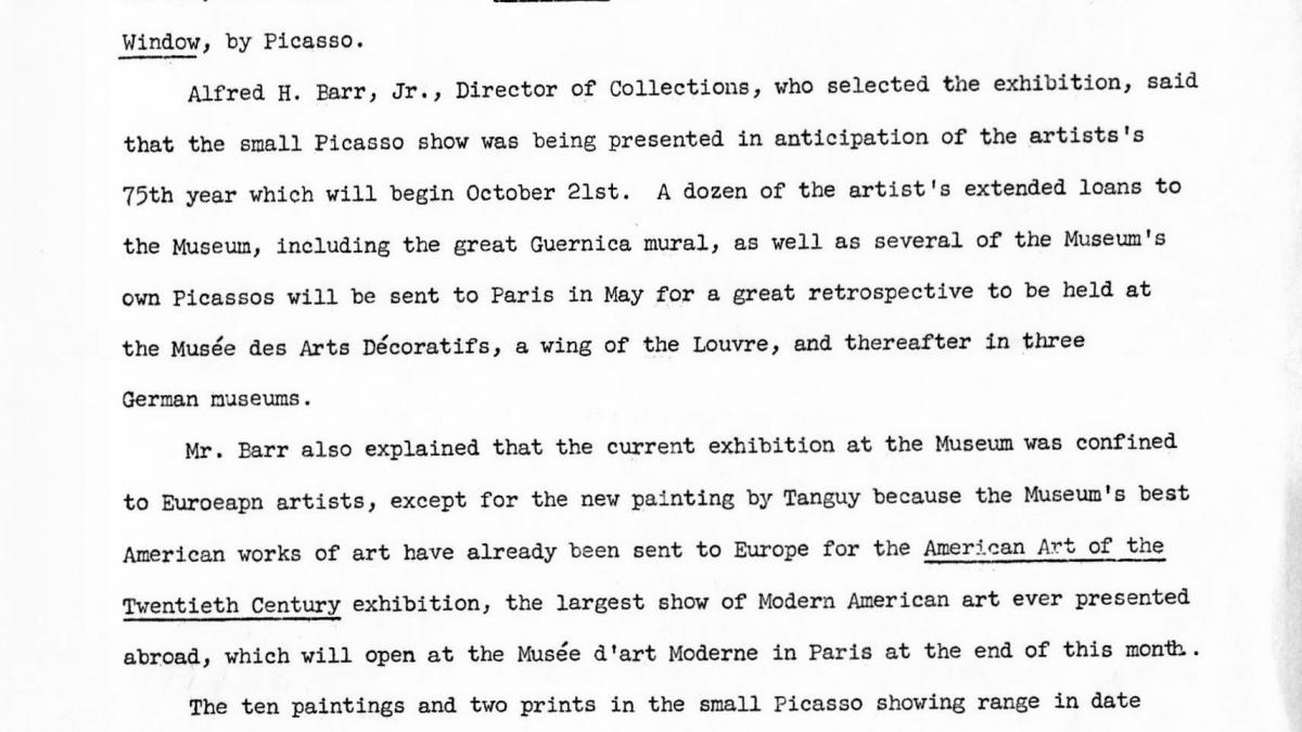 Press release on a special exhibition featuring 12 of Picasso’s masterpieces in New York’s Museum of Modern Art in 1955
