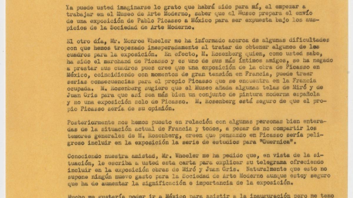 René d'Harnoncourt, vice-president of Foreign Activities at the Museum of Modern Art, New York, voices the concerns to Jorge Enciso, president of the Sociedad de Arte Moderno, Mexico, of Paul Rosenberg, gallerist and a friend of Pablo Picasso's, over the future Mexico exhibition, and the perceived danger from the tensions in France, given that the artist is currently in occupied territory. He offers works by Miró and Juan Gris to turn the show into a reflection of modern Spanish painting, thus leaving out the Guernica studies for security reasons.