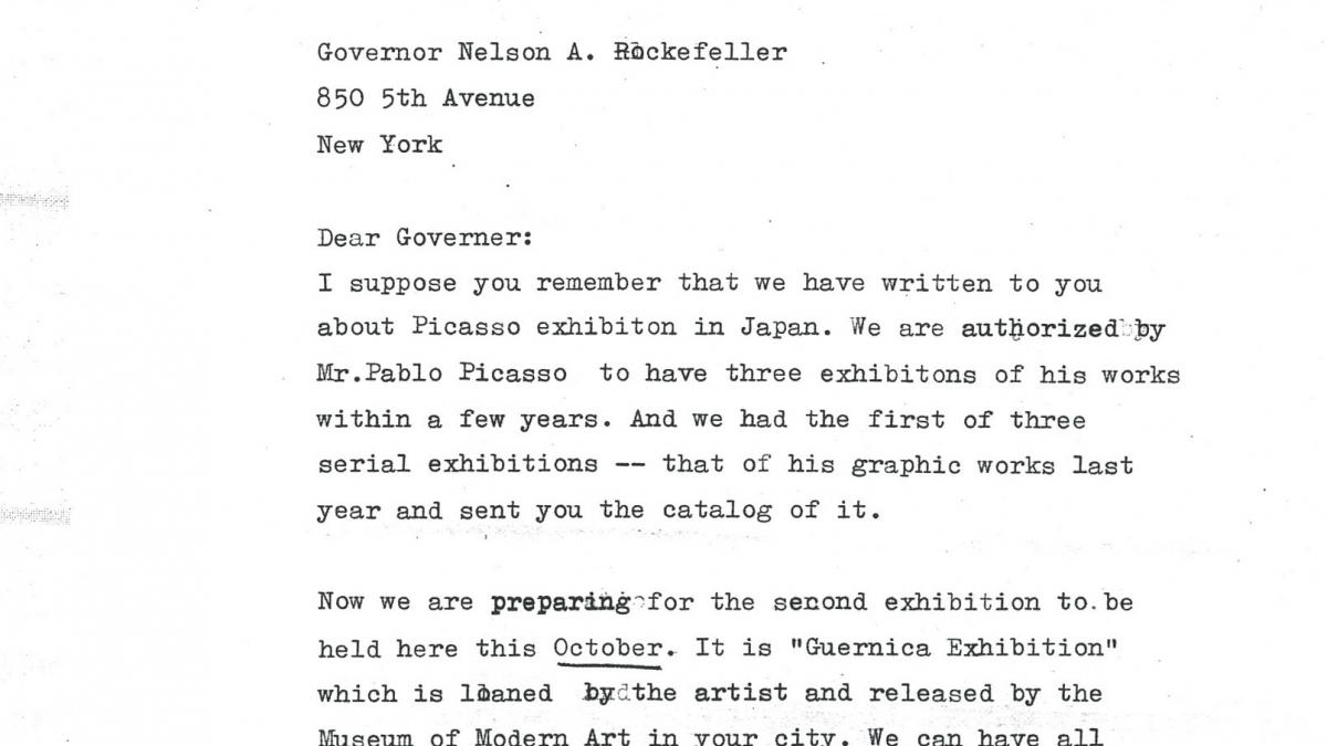 Shinichi Segui, curator of the exhibition on Guernica to be held in Tokyo and Kyoto, sends Nelson Rockefeller a request for the tapestry which recreates the painting, in view of the fact that they will have the studies but not the painting, which hangs indefinitely on a wall in the Museum of Modern Art in New York.