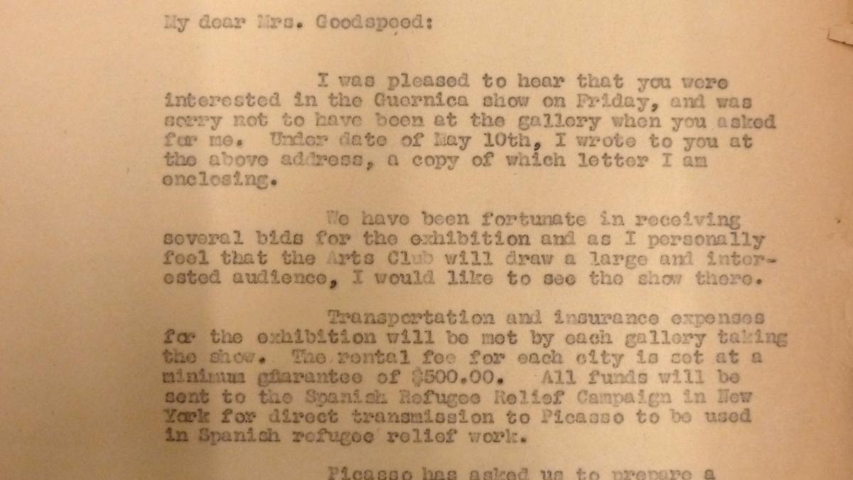 Sidney Janis, director of the Organising Committee of the exhibition Picasso's Guernica, for the Spanish Refugee Relief Campaign, provides Charles Goodspeed, director of the Arts Club of Chicago, with information on the cost and details of the exhibition.