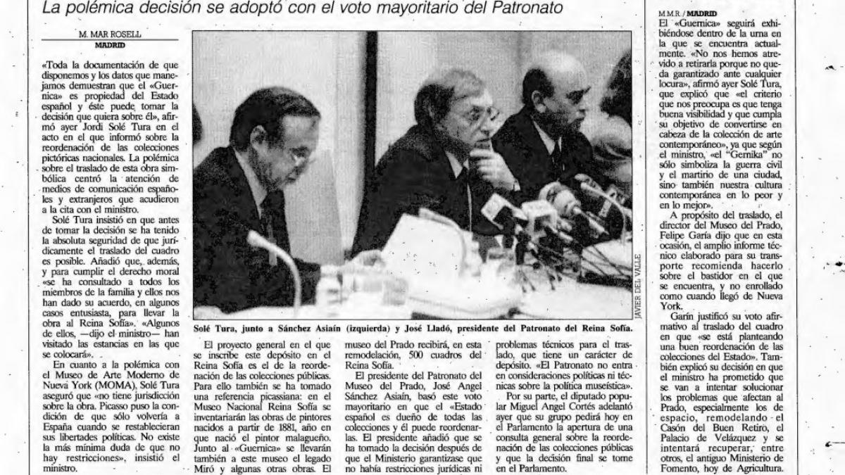 "Solé Tura promete compensaciones al Prado a cambio del traslado del Guernica", Diario 16, May 1992.
