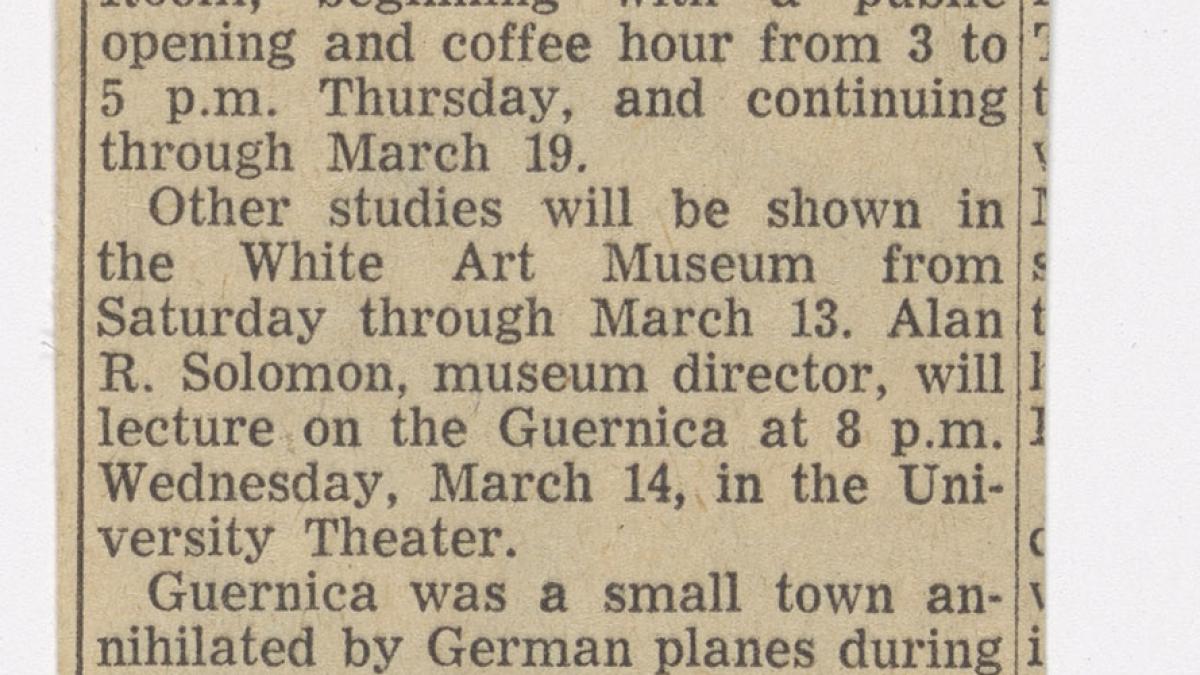 A review published in The Ithaca Journal (Ithaca, New York), dated 27 February 1956, in conjunction with the final show as part of the touring exhibition of Studies for Guernica in the United States.
