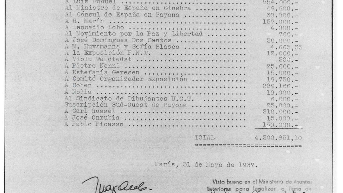 Figures submitted as payment for propaganda between October 1936 and May 1937, signed by Luis Araquistáin, the Spanish ambassador to France, and Max Aub, cultural attaché at the Spanish Embassy.